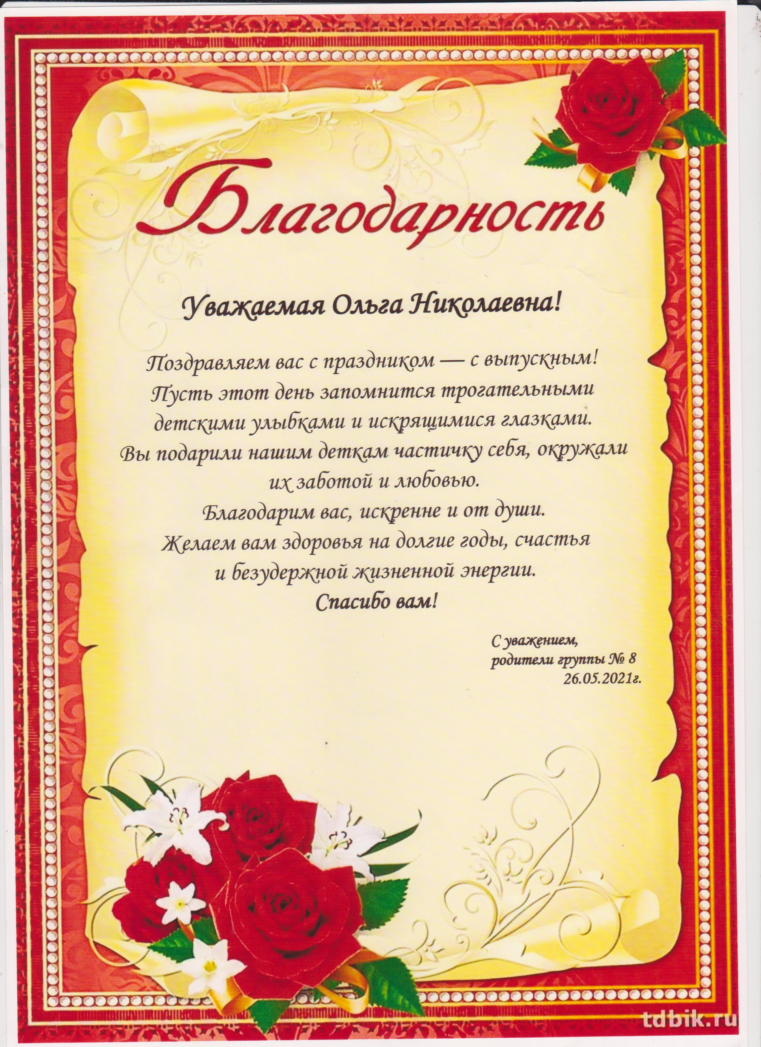 Благодарность от родителей